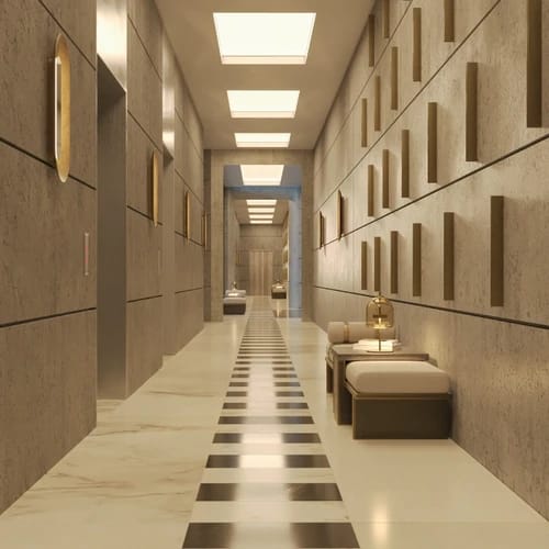 The project features a grand podium with curated lifestyle amenities and a spectacular rooftop infinity pool offering breathtaking skyline views — redefining luxury in Parel.